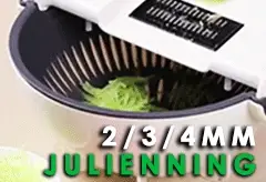 👌🏻قطع واطحن وقشر لشرائح وقطع بأحجام وسماكة مختلفة. تحتوي القطاعة المطورة على 9 شفرات قابلة للتبديل للحصول على الشكل المطلوب.-مقشرة جوليان(2و 3و 4 مم): لتقشير الفاكهه والخضروات كالجزر إلى شرائح رفيعة وسميكة.